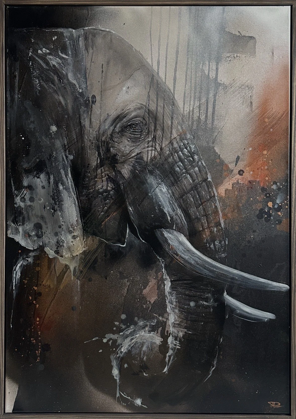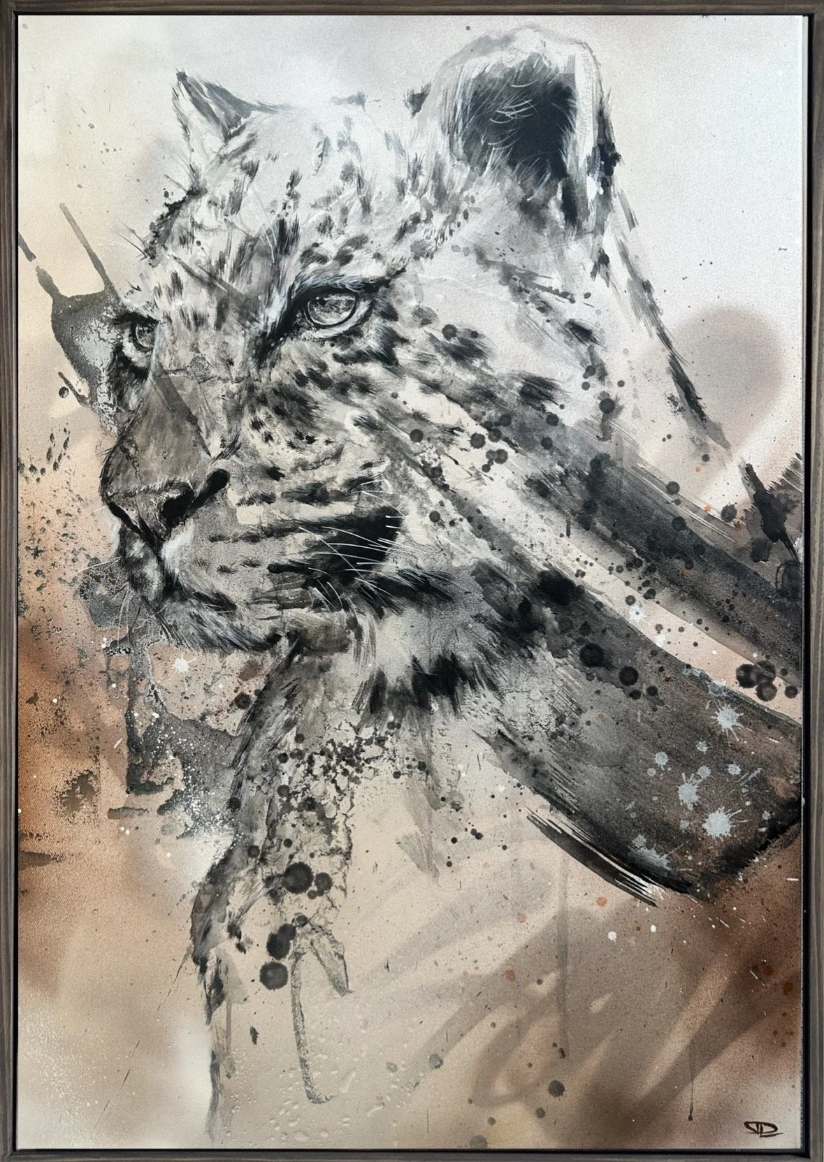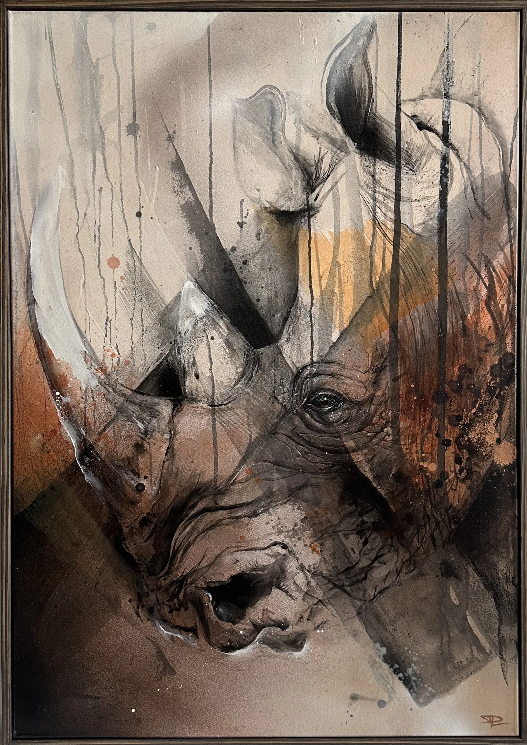 Aerosol and pigments on canvas in a custom dark wooden frame
