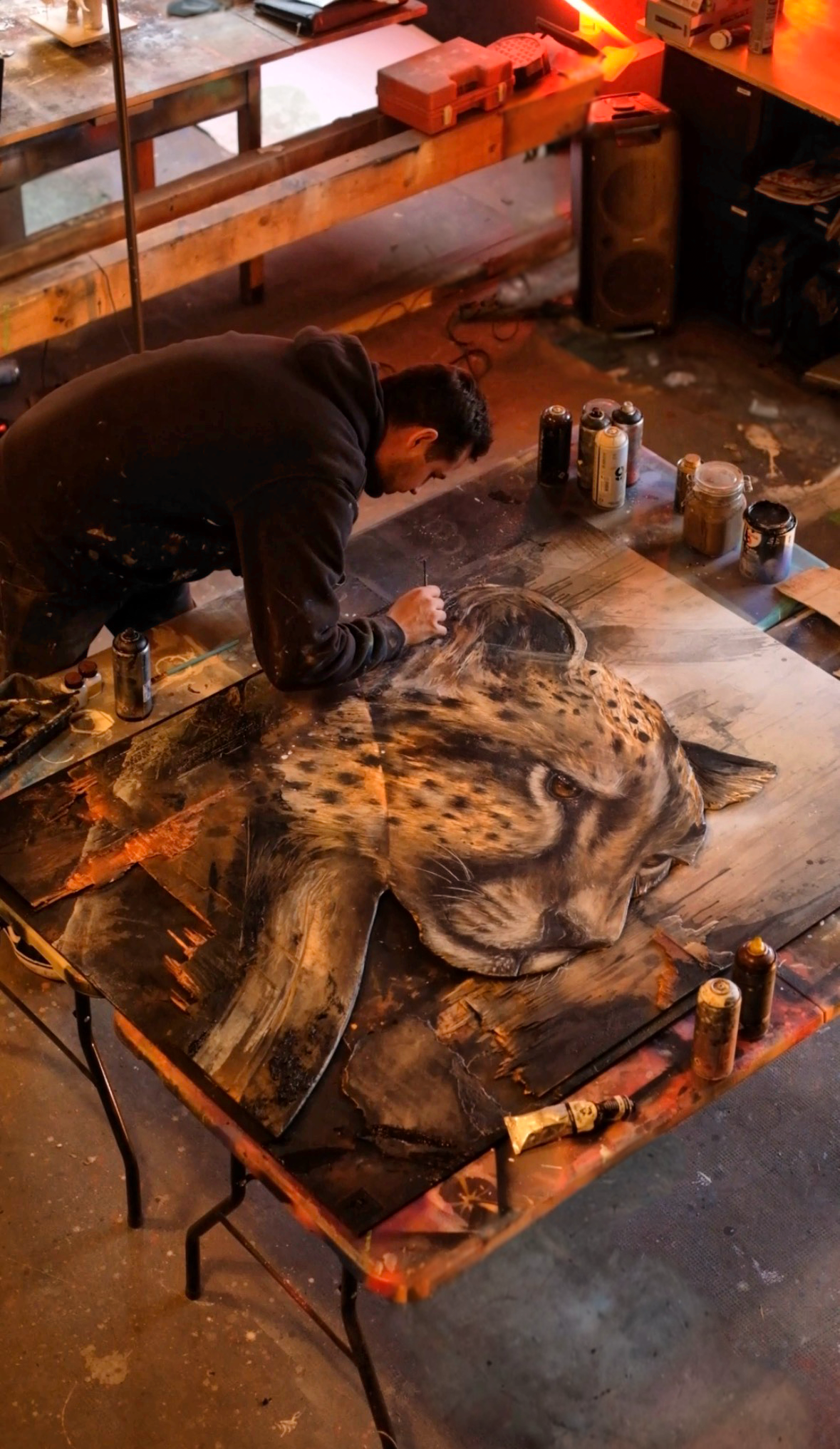 Mixed Media on carved wood composition in a custom museum glass frame. Aerosol, acrylic, oil, gold leaf, pigments, collage, serengeti sand, fire